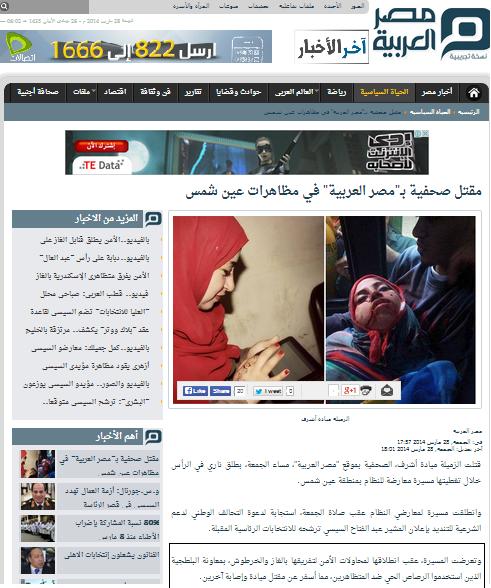 إتهم موقع العربية قوات الامن والبلطجية بالتورط في قتل المراسلة الصحفية الشهيدة ميادة أشرف، أثناء تغطيتها لتظاهرات معارضي الانقلاب في عين شمس بالقاهرة.