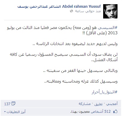 وقال عبر صفحته الشخصية على موقع التواصل الاجتماعى "فيس بوك" :"السيسي هو (ومن معه) يحكمون مصر فعليا منذ الثالث من يوليو 2013 (على الأقل) !! وليس لديهم جديد ليضيفوه بعد انتخابات الرئاسة ..