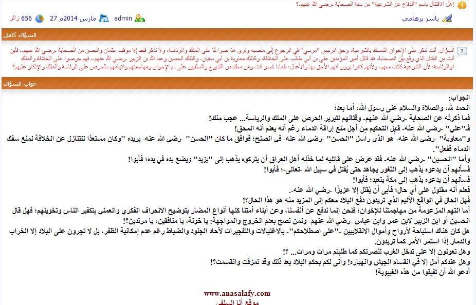 رد الشيخ ياسر برهامي، نائب رئيس الدعوة السلفية وأحد وجوه التيار السلفي المؤيد لانقلاب الثالث من يوليو ، بغضب على سؤال حول شرعية التمسك بحكم مرسي، فاتهم جماعة الإخوان بالمراهنة على انقسام الجيش أو الحصول على الدعم الغربي.