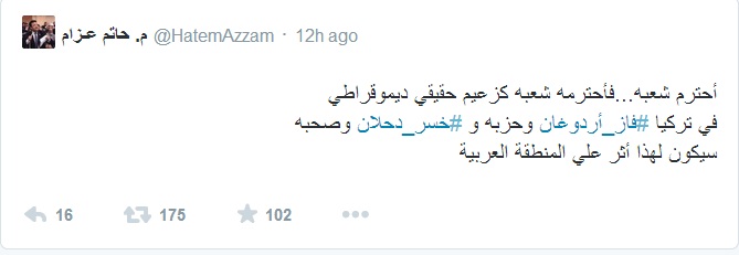 وقال عزام عبر حسابه على موقع التواصل الاجتماعي "تويتر" :" أحترم شعبه…فأحترمه شعبه كزعيم حقيقي ديمقراطي في تركيا فاز أردوغان وحزبه و خسر دحلان وصحبه سيكون لهذا أثر علي المنطقة العربية ".