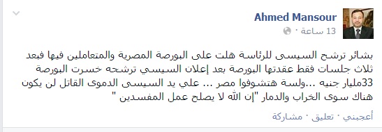 وأضاف منصور عبر صفحته الرسمية على موقع التواصل الاجتماعي "فيس بوك" :" بشائر ترشح السيسى للرئاسة هلت على البورصة المصرية والمتعاملين فيها فبعد ثلاث جلسات فقط عقدتها البورصة بعد إعلان السيسي ترشحه خسرت البورصة 33مليار جنيه …ولسة هتشوفوا مصر … علي يد السيسى الدموى القاتل لن يكون هناك سوى الخراب والدمار "إن الله لا يصلح عمل المفسدين ".