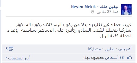 وقالت عبر صفحتها الشخصية على موقع التواصل الاجتماعى " فيس بوك" :" قررت حمله غير تقليدية بدلًا من ركوب البسكلاته ركوب السكوتر .. شاركنا بتخيلك للكذب الساذج وتأثيره على الجماهير بمناسبة الإعداد لحملة كذبة أبريل".