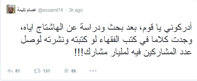وقال عبر حسابه الشخصى على موقع التواصل الاجتماعى "تويتر": "أدركوني يا قوم، بعد بحث ودراسة عن الهاشتاج إياه، وجدت كلامًا في كتب الفقهاء لو كتبته ونشرته لوصل عدد المشاركين فيه لمليار مشارك!!!".