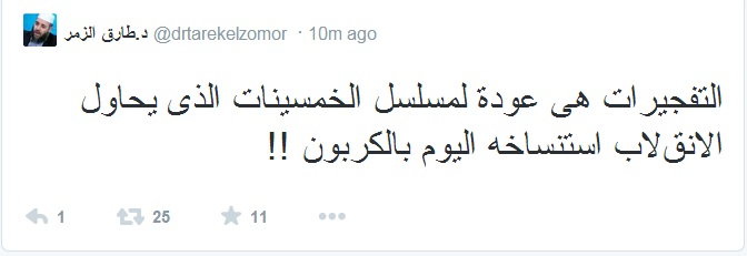 وقال عبر حسابه الشخصى على موقع التواصل الاجتماعى "تويتر" :" التفجيرات هى عودة لمسلسل الخمسينات الذى يحاول الانقلاب استنساخه اليوم بالكربون !!"