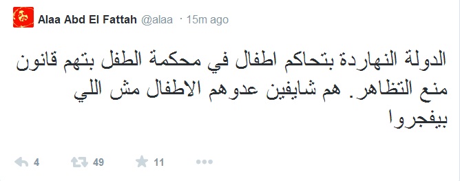 وقال عبر حسابه على موقع النواصل الاجتماعى " تويتر" :" الدولة النهاردة بتحاكم اطفال في محكمة الطفل بتهم قانون منع التظاهر. هم شايفين عدوهم الأطفال مش اللي بيفجروا".