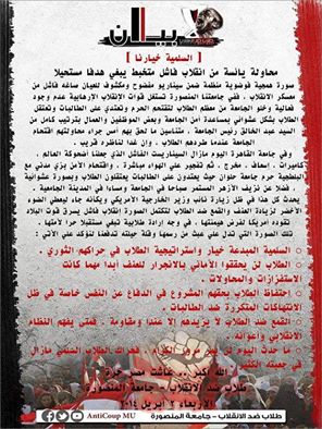 إستغلت اليوم قوات الانقلاب الإرهابيه جامعتنا المنصورة و عدم وجود فعالية ، وخلو الجامعة من معظم الطلاب لتقتحم الحرم وتعتدي على الطالبات وتعتقل الطلاب بشكل عشوائي بمساعدة أمن الجامعة وبعض الموظفين والعمال ، وذلك بترتيب كامل من السيد عبد الخالق رئيس الجامعة ، متناسين ما لحق بهم أمس جراء محاولتهم إقتحام الجامعة عندما طردهم الطلاب ، وإن غدا لناظره قريب .