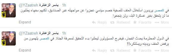 وقال عبر حسابه على "تويتر" : "في الدول المحترمة يحدث إنفجار، فيخرج المسؤولون ليعلنوا بدء التحقيق لمعرفة الجناة ، في مصر يتهمون من يرفض العنف ويدينه ويستنكره !!".
