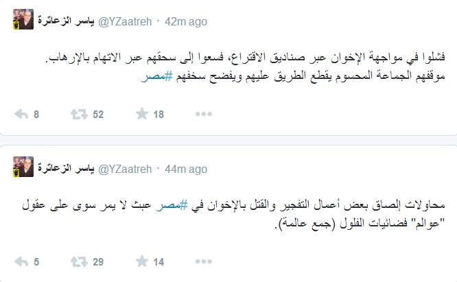 وأضاف :" محاولات إلصاق بعض أعمال التفجير والقتل بالإخوان في مصر عبث لا يمر سوى على عقول "عوالم" فضائيات الفلول".
