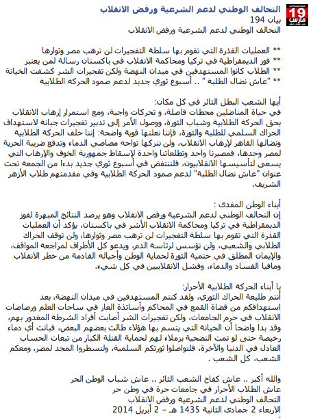 وثمن التحالف الحراك الطلابي في الشارع قائلا : أنتم طليعة الحراك الثوري، ولقد كنتم المستهدفين في ميدان النهضة، بعد استهدافكم من قضاة القمع في المحاكم وأساتذة العار في ساحات العلم ورصاصات الانقلاب في حرم الجامعات، ولكن تفجيرات الشر أصابت أفراد الشرطة المغدور بهم،