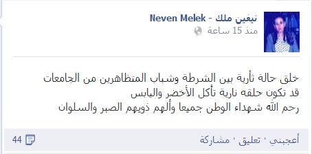 وقالت – عبر صفحتها الرسمية على موقع التواصل الاجتماعي " فيس بوك": "خلق حالة ثأرية بين الشرطة وشباب المتظاهرين من الجامعات، قد تكون حلقه نارية تأكل الأخضر واليابس .. رحم الله شهداء الوطن جميعا وألهم ذويهم الصبر والسلوان".