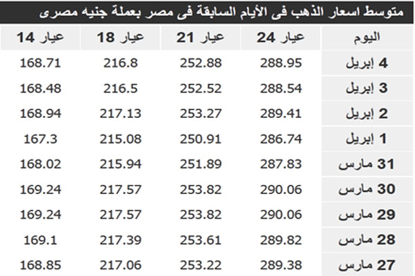 والجدول التالي يوضح أسعار عيارات الذهب خلال الأسبوع