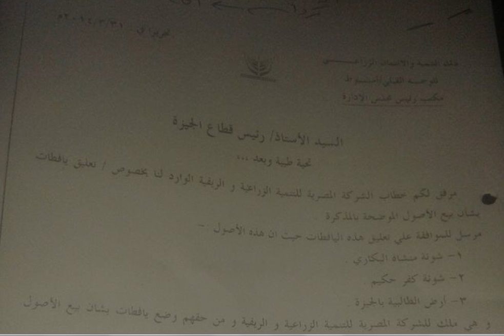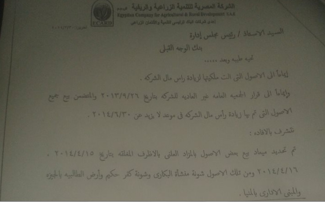 وقال هلال إن منشورا موجهًا من رئيس الشركة الزراعية التابعة للبنك إلي رئيس مجلس إدارة الوجه القبلي للبنك أفاد بأن الجمعية العامة غير العادية للشركة، وافقت في اجتماعها بتاريخ 26 سبتمبر 2013 علي بيع الأصول بالمزاد العلني في 15 و16 من إبريل الجاري، كما طالب المنشور بتسهيل مهمة الخبير المثمن لتعليق اليافطات الخاصة بالبيع علي مقرات الأصول، بحسب "بوابة الأهرام".