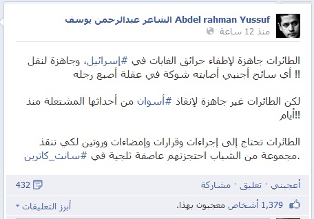 وقال عبر صفحته الشخصية على موقع التواصل الاجتماعى "فيس بوك" :" الطائرات جاهزة لإطفاء حرائق الغابات في إسرائيل، وجاهزة لنقل أي سائح أجنبي أصابته شوكة في عقلة أصبع رجله !! ، لكن