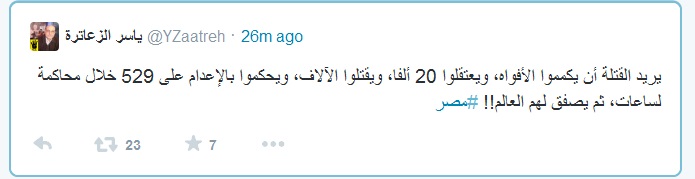 وقال الزعاترة عبر حسابه الشخصي على موقع التواصل الاجتماعي "تويتر" :" يريد القتلة أن يكمموا الأفواه، ويعتقلوا 20 ألفا، ويقتلوا الآلاف، ويحكموا بالإعدام على 529 خلال محاكمة لساعات، ثم يصفق لهم العالم!!".