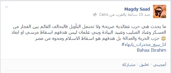 وقال عبر حسابه الشخصى على موقع التواصل الاجتماعى "فيس بوك" :" ما يحدث هي حرب عقائدية صريحة ولا تحتمل التأويل فالتحالف القائم بين الفجار من العسكر وعباد الصليب وعبيد البيادة وبني علمان ليس هدفهم إسقاط مرسي أو إبعاد حزب الحرية والعدالة بل هدفهم هو إسقاط الإسلام ومحوه من مصر".