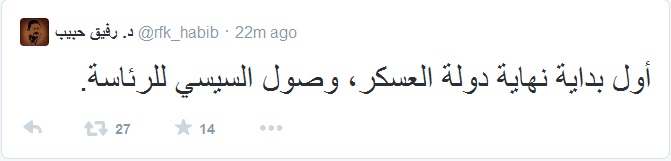 وقال عبر حسابه الشخصى على موقع التواصل الاجتماعى "تويتر" فى تدوينه قصيرة : " أول بداية نهاية دولة العسكر، وصول السيسي للرئاسة.