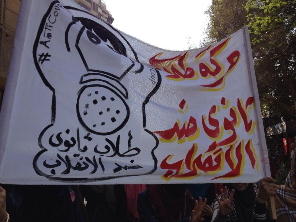 وندد الطلاب باعتقال وقتل زملائهم ورددوا هتافات مناوئة للانقلاب العسكري والإعلام الداعم له ومن الهتافات المردده " أنا طالب حر و هوريكوا المر " ، " إعلامنا يا كداب سلمية مش إرهاب ".