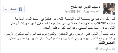 وأضاف عبد الفتاح عبر صفحته الشخصية على موقع التواصل الاجتماعي "فيس بوك" مقاومة الانقلاب ومنظومته تسعة أشهر أمر يحار فيه الخصم قبل المؤيد، ويؤكد أن حال الناس أقوى، ومقاومتهم أمضى، وقدراتهم أكثر فاعلية وأجدى".