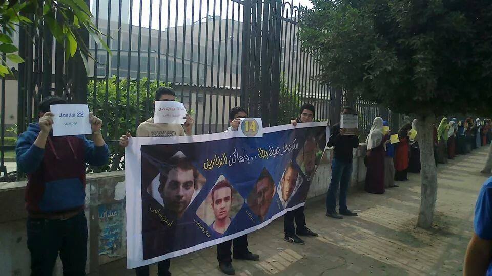 وشارك في الفاعلية عشرات الطلاب رافعين صور المعتقلين مطالبين بسرعة الإفراج عنهم ، وإيقاف قرارات الفصل التعسفى من عميد الكلية.