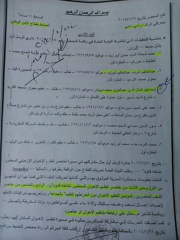 يذكر أن المعتقلين تم القبض عليهم من الشارع بمنطقة سان استيفانو يوم 21/1/2014، وقد لفقت لهم النيابة مجموعة من التهم كالانضمام لجماعة محظورة، واستخدام وسائل العنف من أسلحة بيضاء ونارية ضد عناصر من الجيش والشرطة، فضلا عن إثاره الشغب وتكدير السلم العام.