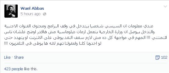 كشف الناشط والمدون وائل عباس أن المشير عبد الفتاح السيسي يتدخل شخصيا في وقف برامج ومنع وسائل إعلام أجنبية من العمل في مصر وسبب ذلك أزمات دبلوماسية مع دول تلك الوكالات.