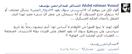 قال الشاعر والناشط السياسي عبد الرحمن يوسف إن المشير عبد الفتاح السيسي، قائد الانقلاب العسكرى ليس رجلا مختلفا عن العسكر بل هو مثقل بأحمال الحكم العسكري وأن من يتوهم أن لديه فكر مختلف عن العسكر أو أنه سيفكر خارج صندوق العسكر وينجح في إنجاز أشياء مفيدة للوطن فهو "واهم" .