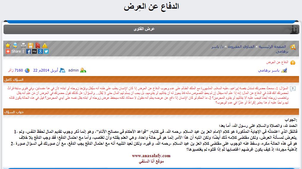 وقال على موقع الدعوة السلفية الرسمي "أنا السلفي" : "فالنقل الذي اعتمدتُه في الإجابة المذكورة هو كلام الإمام العز بن عبد السلام -رحمه الله- في كتابه: "قواعد الأحكام في مصالح الأنام"، وهو إنما ذكر وجوب تقديم المال لحفظ النفس، ولم يتعرض لمسألة العرض، ولكن مقتضى كلامه ذلك أيضًا؛ ولكن انتبه أن هذا الأمر إنما هو في حالة واحدة، وهي العلم بقتله وأن تغتصب، وأما مع احتمال الدفع؛ فقد وجب الدفع بلا خلاف".