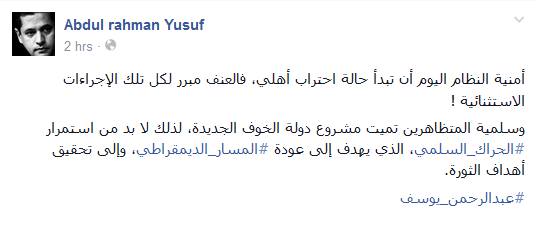 وأضاف يوسف عبر صفحته علي موقع التواصل الاجتماعي "فيسبوك" ، أنة لا مجال الآن للتحدث عن انتصارات شخصية لفرد أو جماعة أو حزب ، أو الحديث عن شرعية مزعومة لحزب أو جماعة أو شخص بعينة".