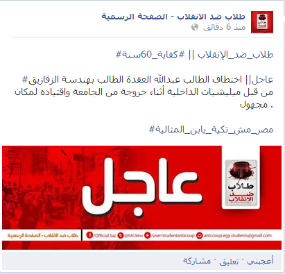 أعلنت الصفحة الرسمية لحركة "طلاب ضد الانقلاب" عبر موقع التواصل الاجتماعي "فيس بوك" أن قوات أمن الانقلاب اختطفت الطالب "عبد الله العقدة" طالب بكلية الهندسة جامعة الزقازيق – منذ قليل – أثناء خروجه من الجامعة.