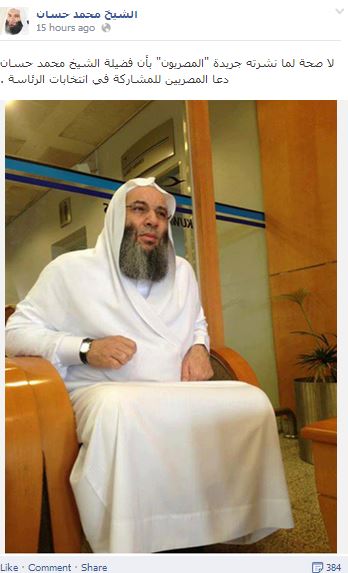 وقال حسان على صفحته الرسمية على فيس بوك التي يديرها نجله أحمد حسان :"لا صحة لما نشرته جريدة "المصريون" بأن فضيلة الشيخ محمد حسان دعا المصريين للمشاركة في انتخابات الرئاسة ."