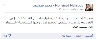 جاء ذلك في تصريحات لمحسوب نشرت على صفحته الشخصية على موقع التواصل الاجتماعي "فيس بوك"، مضيفا أن مصر تحتاج أن يجتمع كل الأطراف لحل أزمتها وبعد ذلك نستبعد من تسبب في هذه الأزمة من الأساس.