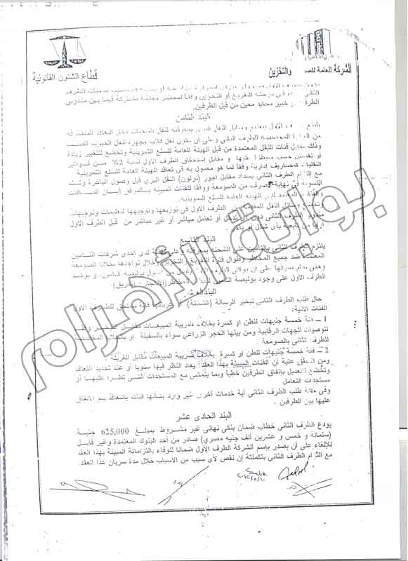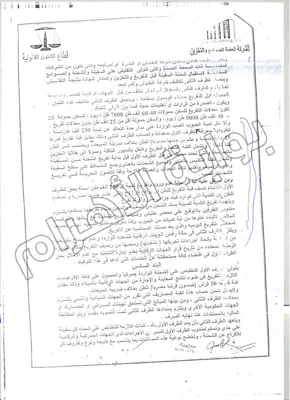 وكشفت مذكرة البلاغ أن البند الخامس من العقد الموقع بين الجانبين نص على أنه في حالة عدم ورود وتفريغ الكميات المنصوص عليها في التعاقد والمقدرة بـ"250"، ألف طن في العام، فإن الشركة العامة للصوامع والتخزين يحق لها الحصول على نص فئة الشحن والمقدرة بـ"12.5"، جنيه للطن كشرط جزائي على عدم التوريد.