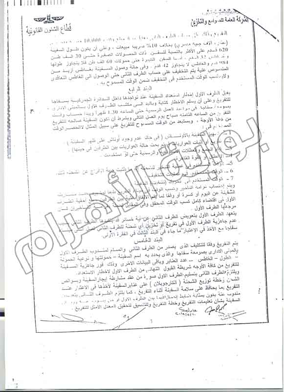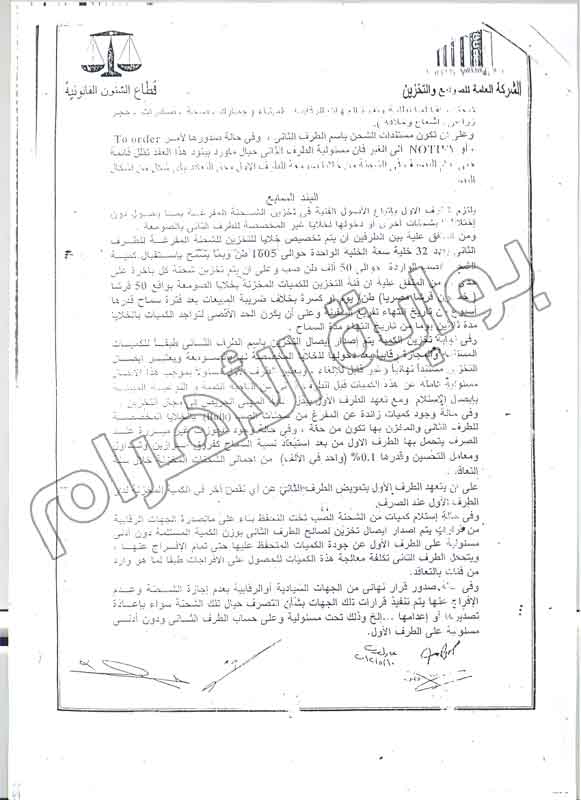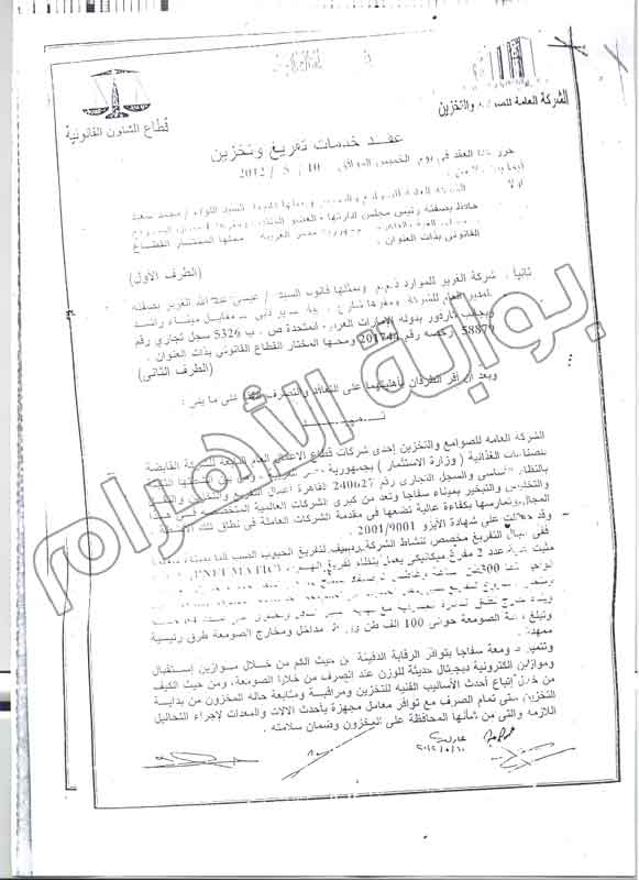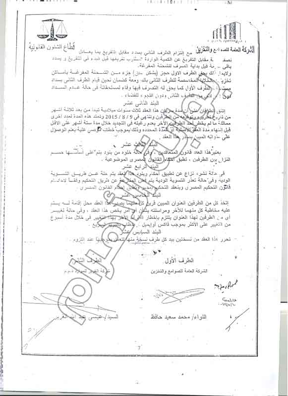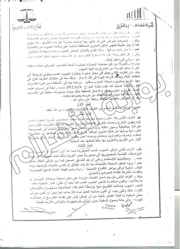 وأوضحت مذكرة البلاغ أن الشركة العامة للصوامع والتخزين تعاقدت مع شركة "الغرير للموارد"، الإماراتية على تقديم خدامات تفريغ وتخزين ونقل أقماح بميناء وصومعة سفاجة لمدة 3 أعوام تبدأ بعد ثلاثة أشهر من تاريخ التعاقد، مشيرة إلى أن العقد تم توقيعه بتاريخ 10 مايو 2012.