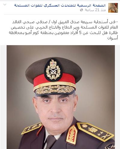 وقال على عبر صفحته الرسمية على "فيس بوك" إن الأمر صدر عن طريق القائد العام للقوات المسلحة الفريق صدقي صبحي " فى استجابة سريعة صدق الفريق أول / صدقي صبحي القائد العام للقوات المسلحة وزير الدفاع والإنتاج الحربي على تخصيص طائرة للبحث عن 5 أفراد مفقودين بمنطقة كوم أمبو بمحافظة أسوان".