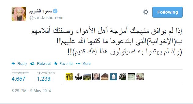 وقال الشريم، في حسابه الرسمي بموقع تويتر: "إذا لم يوافق منهجك أمزجة أهل اﻷهواء وصفتك أقلامهم ب(اﻹخوانية)التي ابتدعوها ما كتبها الله عليهم!!.(وإذ لم يهتدوا به فسيقولون هذا إفك قديم)!!" .