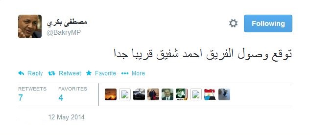 وقال بكري ، على حسابه الرسمي على موقع تويتر اليوم الاثنين، "توقع وصول الفريق أحمد شفيق قريبا جدا".