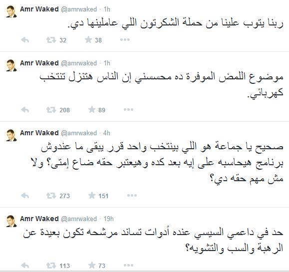 وقال واكد على حسابة الرسمي على تويتر:"موضوع اللمض الموفرة ده محسسني إن الناس هتنزل تنتخب كهربائي ربنا يتوب علينا من حملة الشكرتون اللي عاملينها دي لو نفترض إننا بننتخب كهربائي، ينفع ننتخب كهربائي من غير مفك تيست؟.".