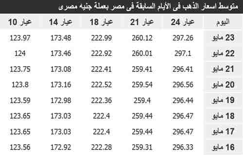 والجدول التالى يوضح أسعار الذهب خلال الأسبوع