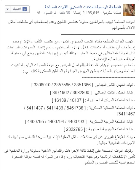 وقال البيان، الذي صدر على الصفحة الخاصة للمتحدث العسكرى العقيد أركان حرب أحمد محمد، على "فيس بوك" أنه تم تخصيص أرقام للاستغاثة وللتواصل المباشر مع غرفة العمليات الرئيسية للقوات المسلحة ومراكز العمليات بنطاق الجيوش الميدانية والمناطق العسكرية كالآتـــي :
