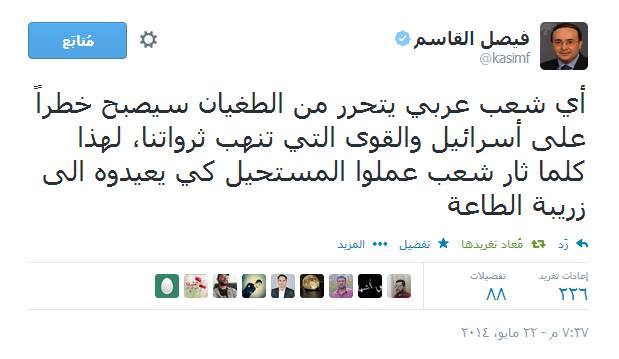 وأضاف القاسم فى تغريدة له عبر موقع التواصل "تويتر": "إن الدول الغربية وأمريكا والكيان الصهيوني، كلما ثار شعب عملوا المستحيل كي يعيدوه إلى زريبة الطاعة".