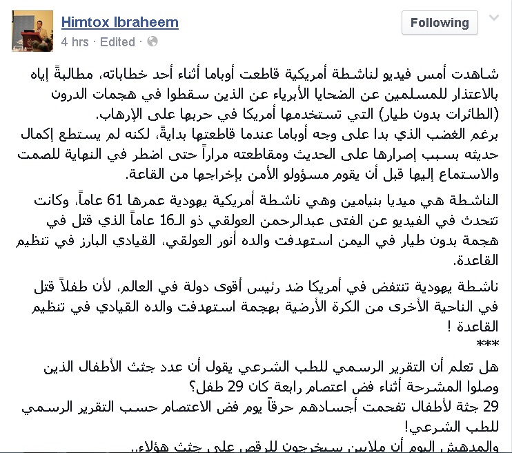 قال الناشط والمدون إبراهيم العوضي أنه شاهد أمس فيديو لناشطة أمريكية قاطعت أوباما أثناء أحد خطاباته، مطالبةً إياه بالاعتذار للمسلمين عن الضحايا الأبرياء عن الذين سقطوا في هجمات الدرون (الطائرات بدون طيار) التي تستخدمها أمريكا في حربها على الإرهاب.