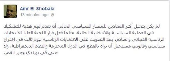 يذكر أن الشوبكي أحد مؤيدي قائد الانقلاب عبد الفتاح السيسي في انتخابات العسكر الجارية.