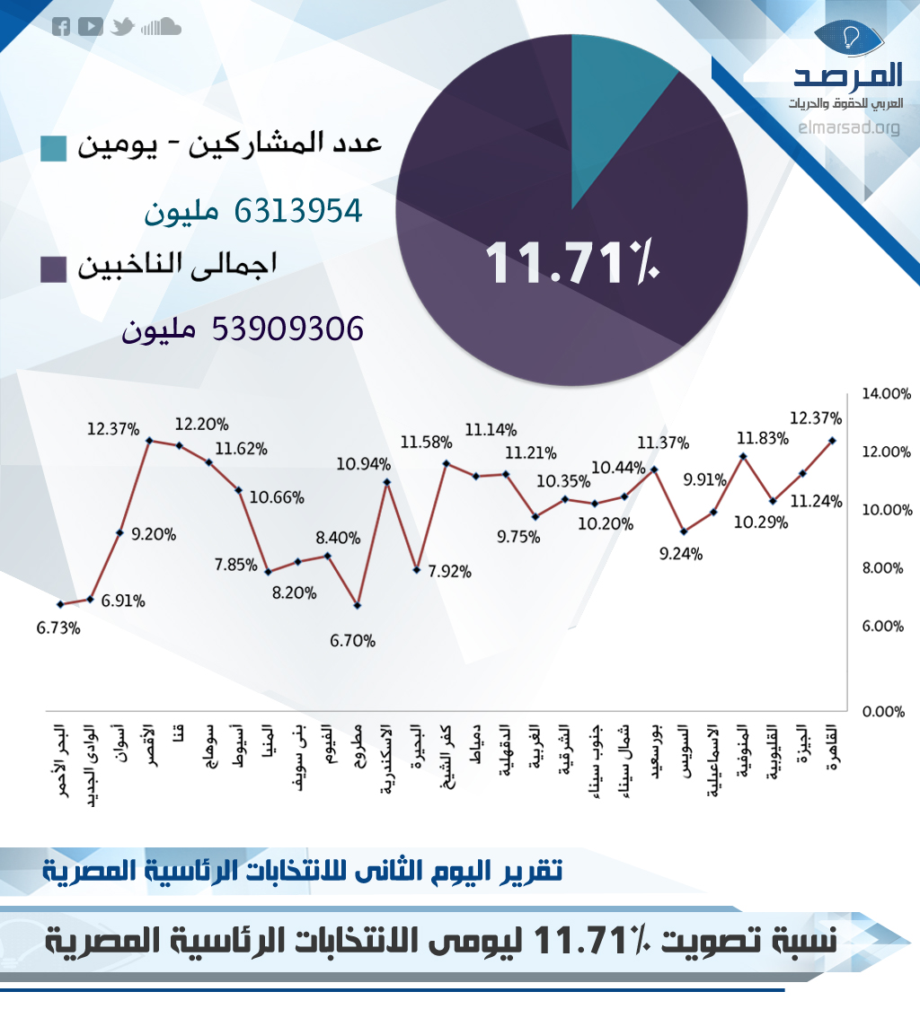 أصدر المرصد العربي للحقوق والحريات تقريره لليوم الثاني عن انتخابات العسكر؛ حيث أعلن أن نسبة التصويت وصلت إلى 11.71% ، وأن الانتهاكات قد ازدادت خلال اليوم الثاني .