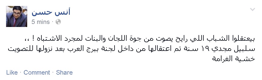 وأضاف حسن عبر صفحته على موقع "فيس بوك": "بيعتقلوا الشباب اللي رايح يصوت من جوة اللجان والبنات لمجرد الاشتباه ! ،، سلبيل مجدي ١٩ سنة تم اعتقالها من داخل لجنة ببرج العرب بعد نزولها للتصويت خشية الغرامة".