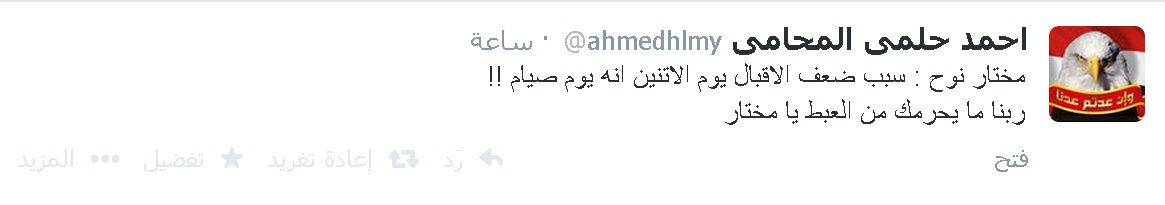 وأضاف حلمى فى تغريدة عبر صفحته على موقع "تويتر":مختار نوح : سبب ضعف الاقبال يوم الاثنين أنه يوم صيام !!، ربنا ما يحرمك من العبط يا مختار".