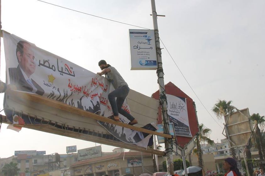 ومزق الشباب لافتات وبانرات للمشير عبد الفتاح السيسي،قائد الانقلاب، مرددين هتافات مناهضة له، ولحكم العسكر، مؤكدين على استمرارهم في فعالياتهم حتى دحر الانقلاب.