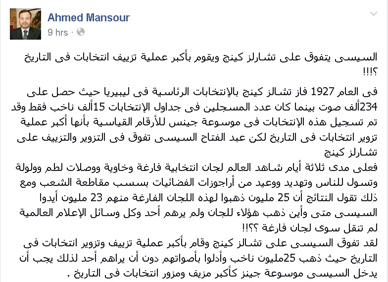 وأوضح منصور : في العام 1927 فاز تشالز كينج بالانتخابات الرئاسية في ليبيريا حيث حصل على 234 ألف صوت بينما كان عدد المسجلين في جداول الانتخابات 15ألف ناخب فقط، وقد تم تسجيل هذه الانتخابات في موسوعة جينس للأرقام القياسية بأنها أكبر عملية تزوير انتخابات في التاريخ، لكن عبد الفتاح السيسي تفوق في التزوير والتزييف على تشارلز كينج".
