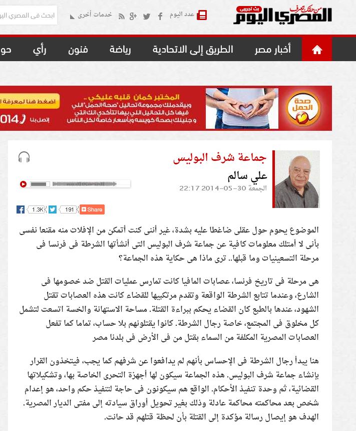 وقال سالم في مقالة نشرت اليوم في صحيفة المصري اليوم: "إن وجود جماعة من الشرطة تعمل في سرية مطلقة، ستكون لديها قدرات أكبر على الحصول على المعلومة المطلوبة، البشر يميلون إلى مساعدة الأقوياء بشرط أن تكفل لهم السلامة".