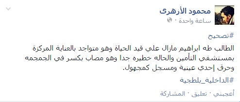 حيث قال في تدوينة له علي موقع التواصل الاجتماعي "فيس بوك"،أن الطالب ما زال على قيد الحياة وهو متواجد بمستشفى التأمين الصحي في حالة خطرة للغاية ، كما أنه مصاب بكسر بالجمجمة وحرق بإحدي عينيه وأن إدارة المستشفى قامت بتسجيله كمجهول.
