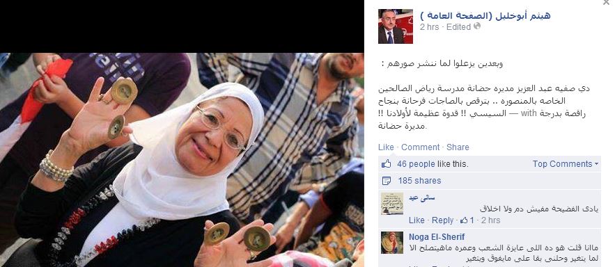 وعلق "أبو خليل" على الصورة قائلاً: "دي صفية عبد العزيز مديرة حضانة مدرسة رياض الصالحين الخاصة بالمنصورة.. بترقص بالصاجات فرحانة بنجاح السيسي! قدوة عظيمة لأولادنا! راقصة بدرجة مديرة حضانة"